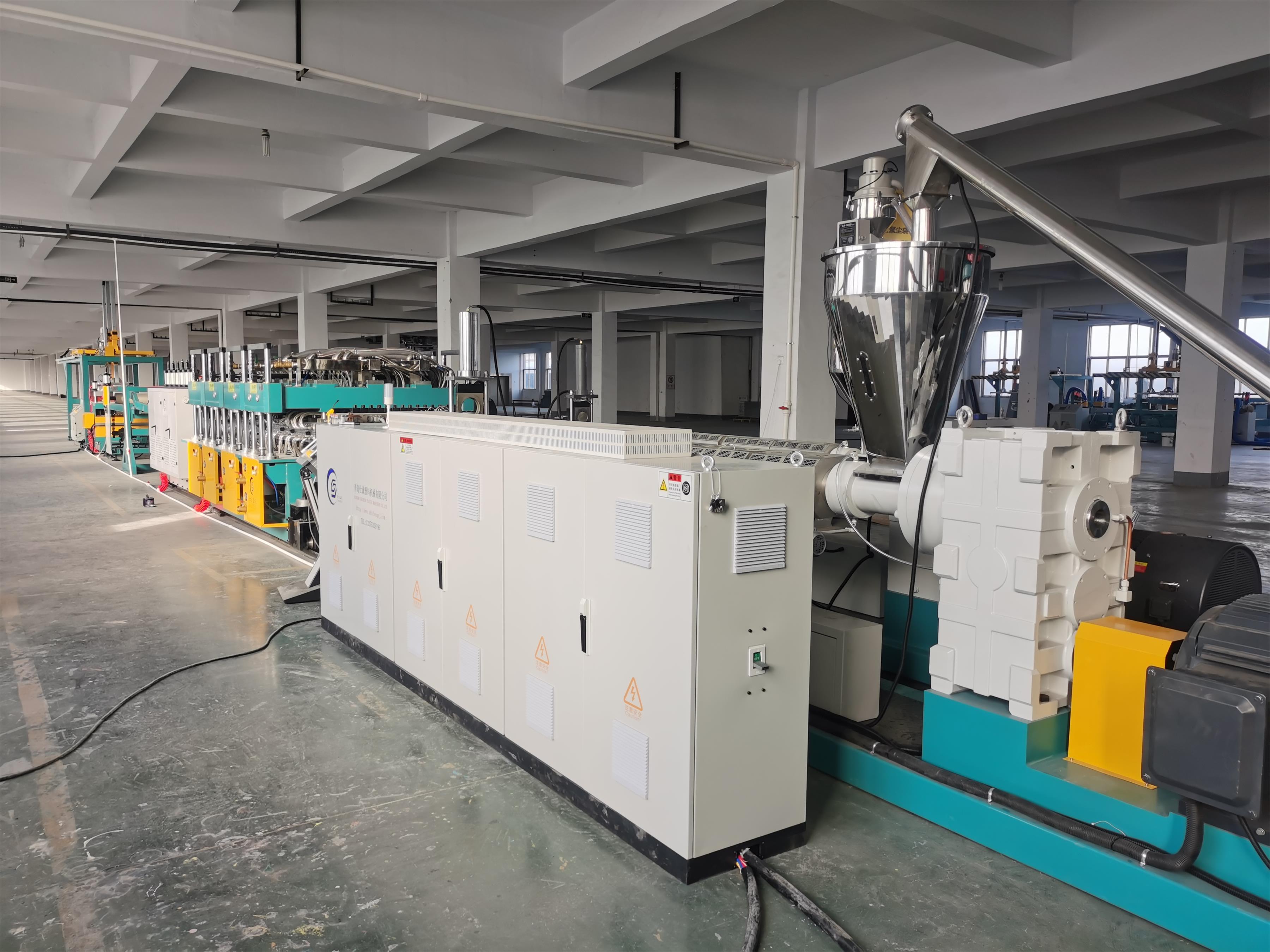 中空建筑模板設備由自動上料進入高速混料、再自動上料到雙螺桿擠出機、由大板模具結構出料進行四節定型模定型、排輥托冷裝置、裁邊裝置、牽引機、自動切割機、排輥輸送機等組成。機組結構緊湊,性能優越。螺桿、螺筒經優化設計,并采用高性能合金鋼加工,使整機具有塑化均勻,擠出量穩定,產量高,壽長等優點。主機螺筒采用鑄鋁加熱器加溫,風冷卻,精密電控儀表控制溫度。精密的定型壓光裝置,通過其良好的調整功能使板材定型優良。切割部分采用定長切割裝置,保證板材長度。板材擠出設備有異向平行雙螺桿擠出機,板材模具,真空定型和八輪牽引等輔機部分組成,應用前景廣闊,廣泛應用建筑材料。具體細節詳情請來電咨詢青島仕誠塑料機械有限公司,我們將根據客人實際要求量身定制方案。到接廠方指導安裝、生產、調試及免費提供技術配方一條龍服務。