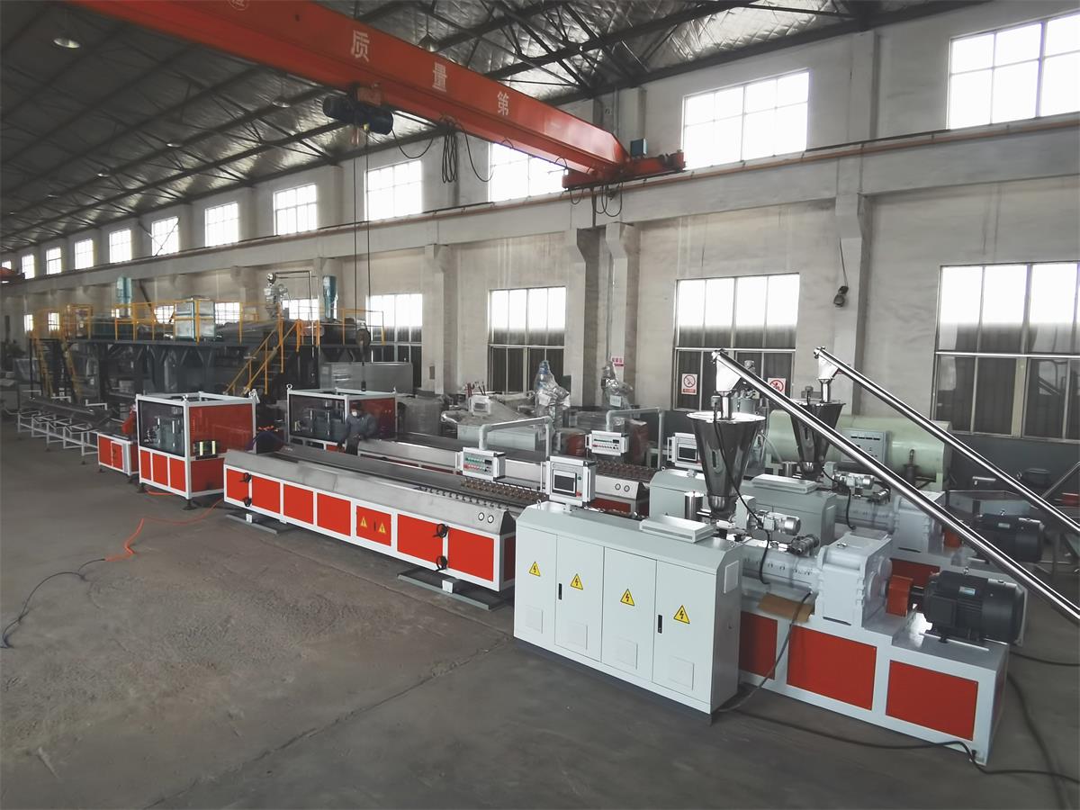 我公司生產的寬幅圍板由SJZ92/188-1000、SZSJ80/156-1000錐形雙螺桿擠出生產線生產,窄幅圍板由SZSJ80/156-600SZSJ65/132-600錐形雙螺桿擠出生產線生產,輔材一般由SJZ51/105-240錐形雙螺桿擠出生產線生產.